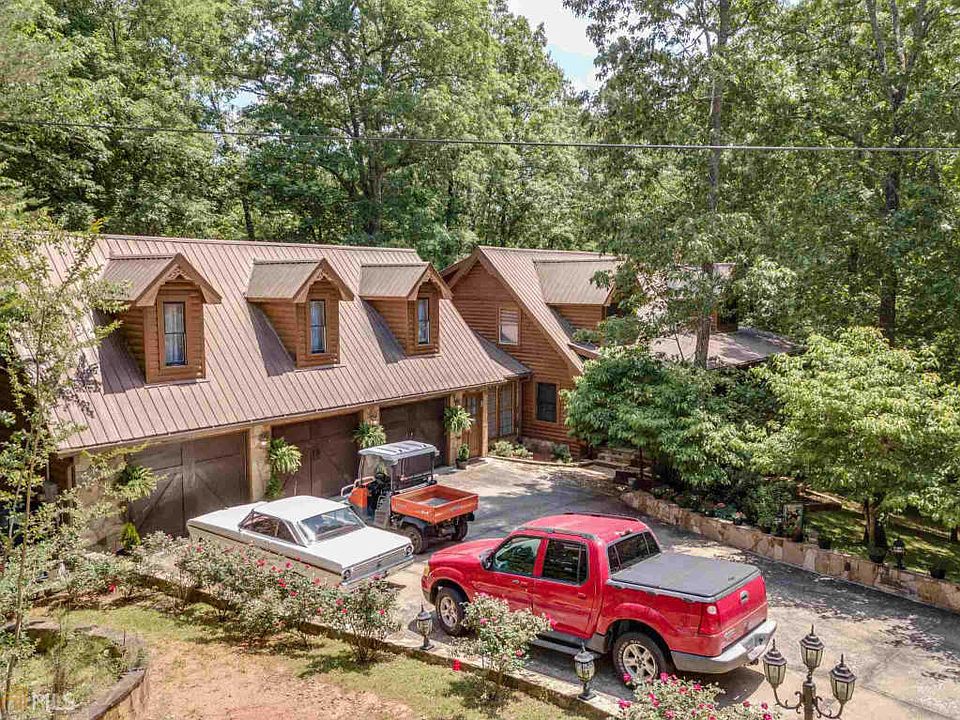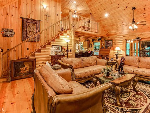 MUST see to take in the custom beauty of this home. Featuring a 2 bd/1 ba apt above the 3 car grg. Stone work throughout is amazing. House has an amazing wrap around porches w/ swing & rockers to enjoy the sounds of the creek at the property line. Sun room across the back faces the hardwoods of this 1.9 acre property. Master on main; w/claw-foot tub. Kit has double convection ovens, micro, & cook top with custom rock wk. The two story family room boasts an impressive rock fireplace. Complete Log home with pine-wood floors. Gated Community access to SOQUE RIVER!