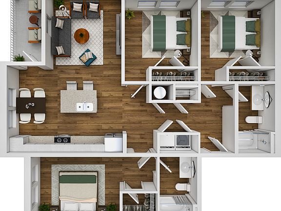 Sleek finishesElegant granite countertopsStainless steel appliancesWood-style floors