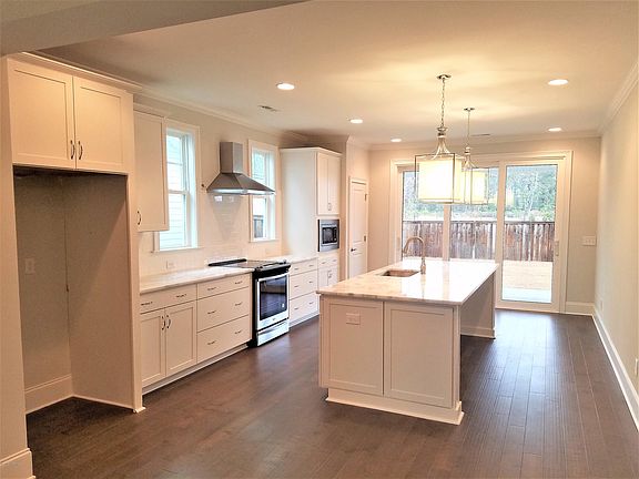 The Hancock home plan offers 1,800 square feet of livings space. Open concept living space with spacious kitchen leading out through 3 door telescoping slider to back covered porch, gas fireplace with built-ins, granite or quartz countertops in kitchen, soft-close drawers, tile backsplash, chimney hood vent, and large kitchen island. Large master suite with walk-in closet including wood shelving, fully tiled shower, and trey ceiling. LVP flooring throughout living areas. Fiber cement board siding, full sod and irrigation, with a fenced back yard, and rocking chair front porch. Large unfinished bonus room pre-plumbed for bath over the garage. Great trim package and landscaping.