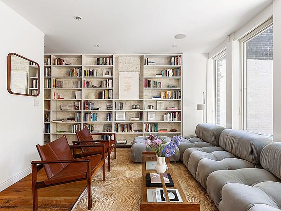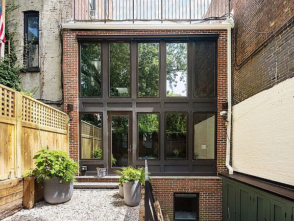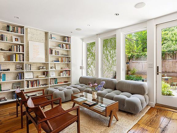 Entering from the garden level, oversized western windows facing the garden allow generous light into the living space. 12” pine board flooring complements the whitewashed exposed brick walls and the steel and wood stairway. The chef's kitchen, with windows facing the trees on Nevins, is outfitted with high-end appliances, including a six-burner Blue Star range and a Viking refrigerator. The countertops are marble, wood, and stainless steel, a design that is both aesthetic and practical.