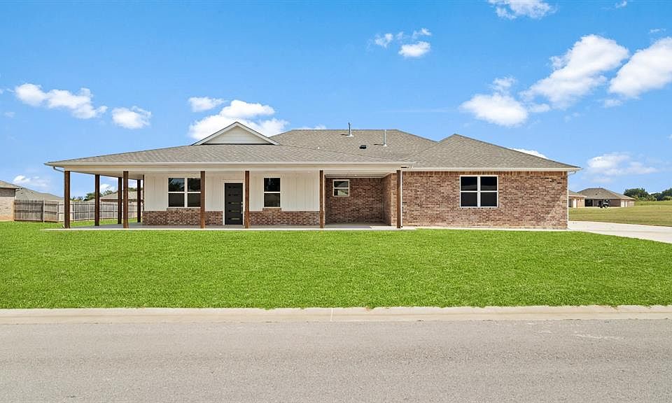 Nestled in the peaceful Olde Mill community of Jones, this newly built 4-bed, 3.5-bath home sits on nearly an acre (0.79) and offers both serenity and sophistication. From the inviting wraparound porch to expansive back patios with ceiling fan, every detail is designed for relaxation and entertaining. Full gutters and an oversized 3-car garage add curb appeal and convenience. Inside, wood-look tile floors, designer fixtures, and large energy-efficient windows create a bright, welcoming atmosphere.