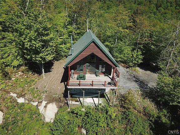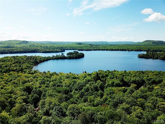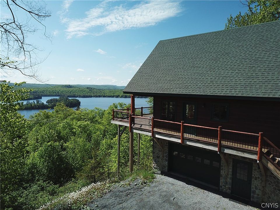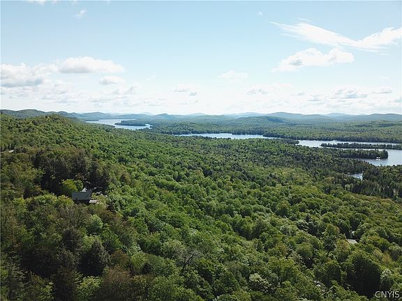 IMAGINE ENJOYING THIS PANORAMA and almost new Adirondack cabin in the woods. Great room area has fireplace and glass window wall with endless views of Fulton Chain and mountains, 3 bedrooms, 2 baths. Full basement with garage, large deck and energy efficient furnished cabin offering year round living. Easy access to snowmobile trails and beach access by association.