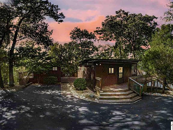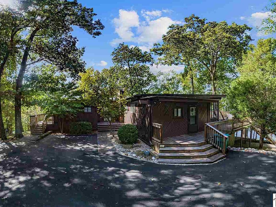 Peaceful and Private WATERFRONT retreat located on Little Bear Creek on KY Lake! As you enter through the PAVED & GATED ENTRANCE you realize you have arrived to a special place! Located on a rare 3.02 acre point lot, this 3 bed/2.5 bath cabin is positioned to enjoy the 180 degree year round water views! The property has 920 feet of TVA contour plus deep water year round! A 34'x40' covered aluminum 2-boat dock with (2) 6,000 lb lifts and a small boat house for storage. Inside: open floor plan, hardwood flooring, gorgeous water views from every room, sunroom, screened porch, fireplace, decks on both levels. Underground power, natural gas. Also on the property is a roughed in boat ramp. Plenty of parking for entertaining!