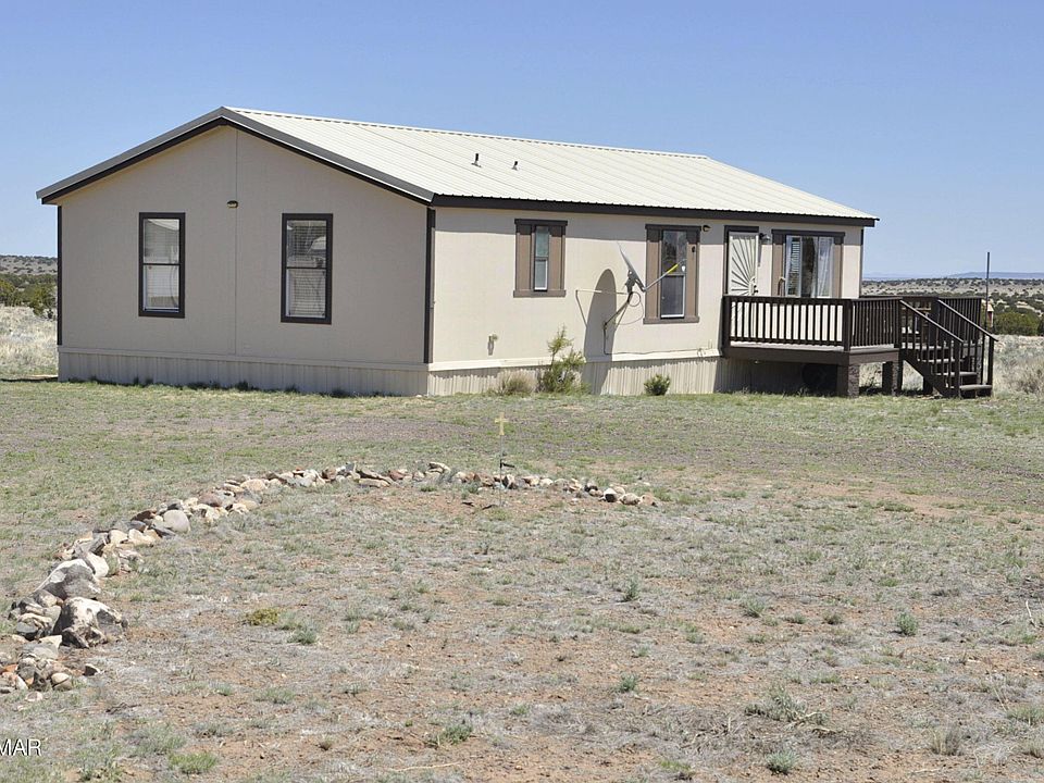 2BD/2BA, 1056 sq ft home on 5+ fenced ac. 2003 home in great condition. Gardeners delight with years of devotion to an elaborate garden set up. County maintained roads w/easy access to Hwy 61 and about 30 min to Show Low. Appliances only 3 yrs old. All electric hm & metal roofs on all buildings. 20 x 22 carport. Front & back decks to enjoy the good views from. 10 x 20 shed (powered by solar), 8 x 10 shed, green house, patio of pavers, raised garden beds, rose garden, 3 cherry, 1 peach, 5 apple, & 1 apricot tree. Green & Concord grapes raspberry, strawberry, Navajo Willow, Honey suckle & herbs, all fenced in. Plenty of room for dogs, horses, etc. Nice backyard bbq area, quiet & private. Sunday showings after 2pm