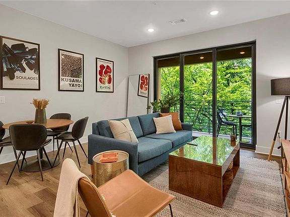 Welcome to elevated intown living at Pullman Flats! This exceptional residence offers a sophisticated urban retreat in the heart of Historic Kirkwood. Step into a meticulously designed space featuring soaring 10-foot ceilings and an open-concept layout that bathes the home in natural light. The outdoor patio off of the living room has private wooded views perfect for relaxing with a great cup of coffee! There is a second private balcony with gorgeous views off of the primary bedroom too! The sleek, contemporary kitchen boasts white cabinets, stainless steel appliances, and gorgeous white quartz countertops, perfect for both everyday living and entertaining. Throughout the unit, you'll find top-quality 7" LVT flooring, adding to the modern aesthetic. As a resident of Pullman Flats, you'll enjoy a full suite of first-class amenities. Unwind or entertain on one of the two expansive rooftop decks, complete with an open-air entertainment room, TV, and grilling station. There's also an outdoor terrace featuring dual fireplaces, perfect for cozy evenings. Stay active in the well-equipped fitness center, and even pamper your furry friend at the convenient pet spa. Secure gated parking provides peace of mind. Seller has even leased a second parking spot that is transferrable to the buyer! Beyond your door, the vibrant Kirkwood neighborhood awaits. Directly across the street, the iconic Pratt Pullman District offers an array of cultural events, entertainment, unique restaurants, and shops. Enjoy easy access to the Atlanta Theatre, Arizona Avenue Soccer Park, and a short walk or bike ride to MARTA, the Atlanta BeltLine, Little Five Points, and Virginia-Highland. For commuters, Downtown/Midtown, major hospitals (Emory, Piedmont, Grady), and universities (Emory, Georgia State, Georgia Tech, Spelman, Morehouse, Clark Atlanta) are just a few miles away. This pet-friendly unit provides the perfect blend of luxury, convenience, and location. Don't miss your chance to experience the best of Atlanta living at Pullman Flats!