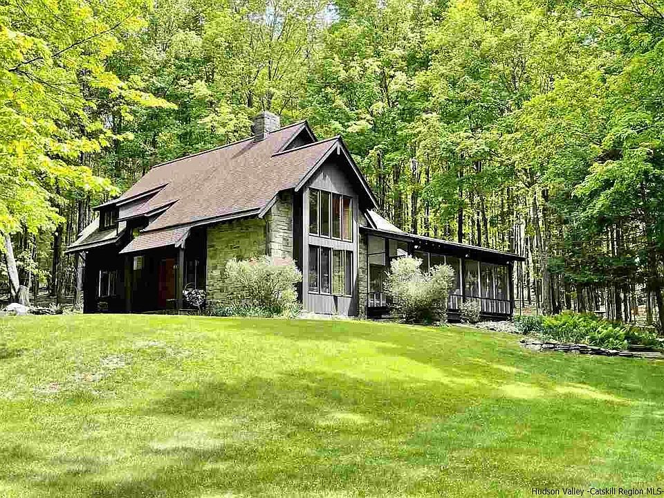 Paradise found.... Sited on a long drive off a dead end country road sits a perfect year round retreat. Off to the right of the driveway and you will see stone walls showcasing a pond surrounded by lush growth and a magnificent stone patio ideal for gatherings of friends and family. Massive stone steps lead to this striking stone and wood home. High ceilings, tons of light and a great flow make this a grand property for entertaining. You will absolutely fall in love with the living room which enjoys an impressive floor to ceiling stone fireplace, custom trim work and a two story wall of glass overlooking manicured grounds. The kitchen has custom cherry cabinets with "iceberg" quartz countertops and stainless appliances and opens directly into the dining area. Don't stop there because the best is yet to come. You will find yourself living on throughout the warm months on an extraordinary wrap around screened porch with teak flooring It is like having another living space. Want to be outdoors? Listen to the waterfalls from the deck or patio. Guest are upstairs with 2 lovely bedrooms, a airy loft space and a cozy and bright sitting room/den. There is not much more that you will need to make this the perfect place to be! Take a look.... You will not be disappointed.