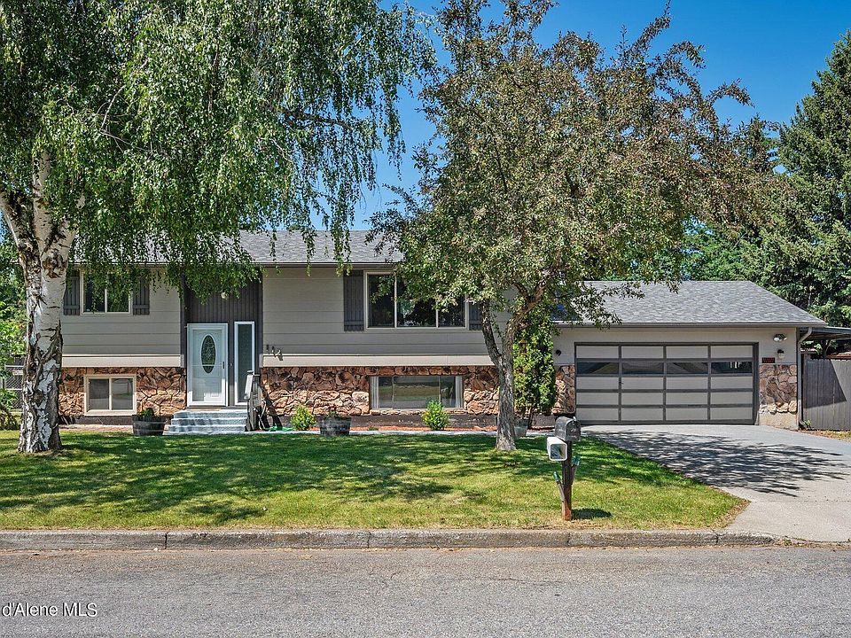 Charming 2136 sq. ft. home with 4 bedrooms (one nonconforming) and 3 baths on a generous .26-acre lot! Just minutes to the Spokane River, city beach, and multiple parks! Wonderful kitchen featuring a breakfast bar, stainless appliances, large dining area, tile flooring and a sliding door to the covered back deck! Spacious living room boasting a wood-burning fireplace, ample windows for natural light and crown molding! The master bath and the guest baths have been nicely updated! Downstairs you'll find a generous family room great for entertaining with a cozy fireplace insert, laundry area and storage room with shelving! Be comfortable year-round with a/c and an attic fan! Great curb appeal with a darling side patio and a 2-car garage with shelving! There's also a lean-to for covered storage and RV parking! The huge backyard offers mature landscaping and privacy fencing, perfect for relaxing in the hot tub! You'll also enjoy two garden sheds and a cozy firepit for those chilly nights!
