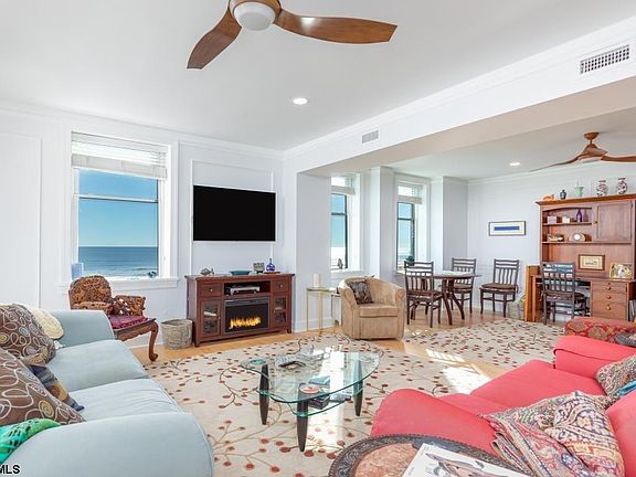The ocean is right there! Elegant oceanfront living in Ventnor's historic Art Deco Oxford Condominium building. Comprising the entire third floor oceanfront of this intimate 10-story building on the boardwalk, combined-unit 301/302 is a rare offering of one of the building's few units with a large open floor plan living area and direct ocean views from the living room, dining area & kitchen. With 4 ocean front/ocean view bedrooms & 3.5 baths (one with a window on the ocean), this home's spaces were combined & completely renovated in 2020. It features a new two-zoned HVAC system, elegant ceiling fans, maple hardwood floors, ensuite master bath with rain shower, quality fixtures including touch kitchen faucet, & sauna. The unit retains its period charm through high ceilings, picture frame moldings & abundant natural light. The building offers a breathtaking Art Deco lobby with doorperson services & a beautifully landscaped pool/hot tub area. 301/302 comes with 2 parking spaces & accommodates 4 bicycles in the bike room & 8 beach chairs in the chair storage room. Turn-key is possible with designer rugs & furniture, electric fireplace, new OLED wall-mounted TV plus two others, beach gear & 3 bikes. The boardwalk in front of this centrally located building runs 1.8 miles north to Atlantic City, & to the Margate city line to the south. Nearby are many exciting new & old-time favorite restaurants, shops, & the new Ventnor Square Movie Theater with Nucky's Kitchen & Speakeasy.
