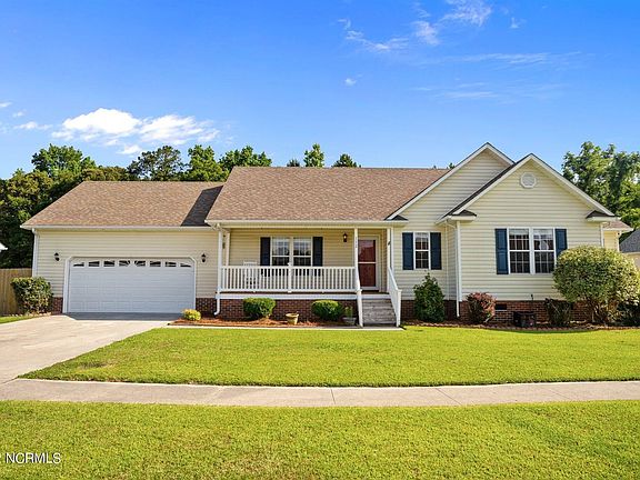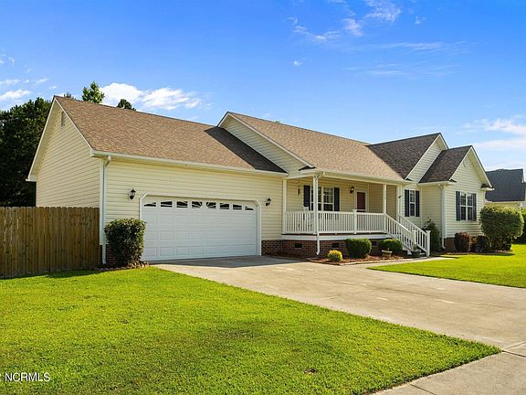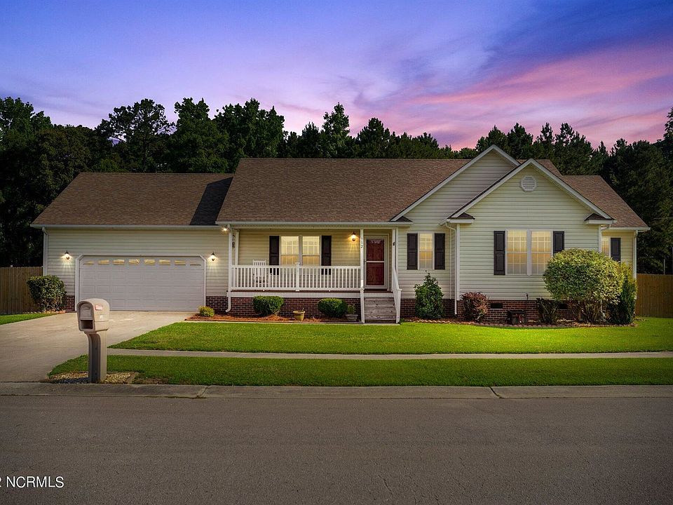 This well-maintained home sits along the picturesque sidewalk-lined streets of the charming and serene Sagefield subdivision. Here you will enjoy all the benefits of being close to everything while feeling as though you're away from it all. Featuring no city taxes or HOA, this neighborhood is less than 5 minutes to MCAS New River, 15 to MCB Camp Lejeune, and less than 25 minutes until you're feeling the sand between your toes on Topsail Island! This home sweet home will greet you with a delightful front porch -- perfect for sittin' and sippin' lemonade on a hot summer day. As you enter, notice how there's no carpet! Also take note of the high vaulted ceiling and the fireplace tastefully adorned with stacked stone. The open layout allows for the most beautiful natural light to peek in through the windows which makes for a clean and airy ambiance. In the kitchen you'll find magnificent white cabinetry and stainless appliances. The back door opens to a large deck overlooking the fully fenced-in yard -- perfect for gardening, entertaining, and made to perfection with your very own chicken coop! Head back inside to check out the spacious master suite boasting a custom tiled walk-in shower and walk-in closet. To add, all of the bedrooms already have ceiling fans and the garage has tons of workspace for your next project. This is a very desirable home in a very desirable neighborhood, so don't wait -- schedule today!
