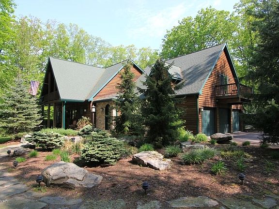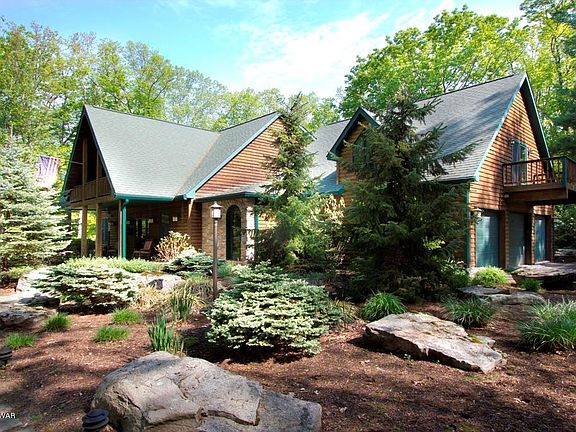 Exquisite custom built cedar chalet home overlooking Paupack Hills Golf Course with an attention to detail, inside & out. Tongue & groove cathedral ceilings, radiant heat, imported Spanish ceramic tile, see through fireplace, finished lower level, whole house generator, extensive landscaping & fencing, cedar barn with loftan entertainer's delight offering an open floor plan, well appointed kitchen with granite counters, game room with wet bar & room for outdoor entertaining. Truly a must see!