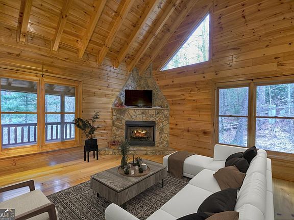 NEW PRICE! Nestled between Ellijay and Blue Ridge in the desirable Buckhorn Estates community, this 3BR/3BA mountain cabin perfectly blends cozy charm with modern comfort. Enjoy all-paved access, a paved driveway, and a rare 1-car garage with storage-plus a new split-rail fence lining the drive for that classic mountain welcome. Inside, the spacious great room boasts wide-plank wood floors, a stunning stone fireplace with gas logs, and cathedral ceilings with exposed beams. The granite kitchen with custom cabinetry and open dining area makes entertaining easy, and the thoughtful layout-a bedroom and bath on each level-offers ideal privacy for family or guests. Take in the "Treehouse Vibes" from the full-length rocking chair porch or sip morning coffee on the upper balcony surrounded by birdsong and forest views. Additional features include a new Carrier HVAC system, 12KW whole-house generator, and some furnishings included for turnkey convenience. Buckhorn Estates offers paved roads, high-speed internet, a river park within walking distance of this cabin (great for walking your dogs), 8-acre community lake, and access to Whitepath Golf Course-all for just $225/year HOA dues! No STRs allowed, ensuring peace, quiet, and a true sense of mountain community year-round.(Less than 10 minutes to Roo Vineyards, The Mushroom Farm Store, and Cress Creek Farm.)