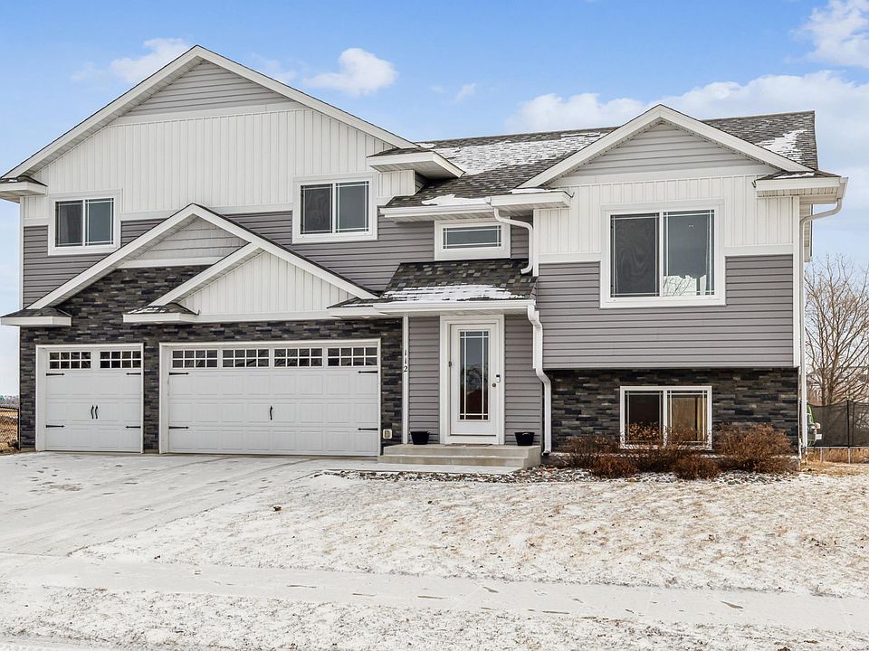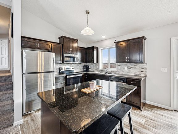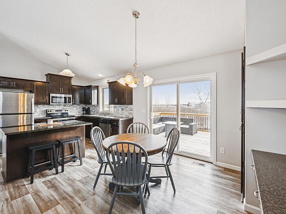 bedrooms on 1 level and open concept kitchen living / dining / living room. Modern kitchen with upgraded cabinetry, granite countertops, & stainless appliances. Large primary bedroom with a full master bath & dual sinks. Rich wood millwork and enameled trim throughout. Plenty of storage space in the extra deep, heated, 3 car garage with built-in shelving. Walkout basement is ready to finish and make it your own with plumbing already roughed in for a third bathroom. Large corner lot with updated landscaping, lawn sprinkler system, and a wetland in back that creates a quiet place for entertaining. New deck in 2024!