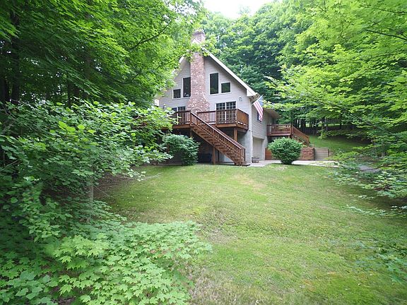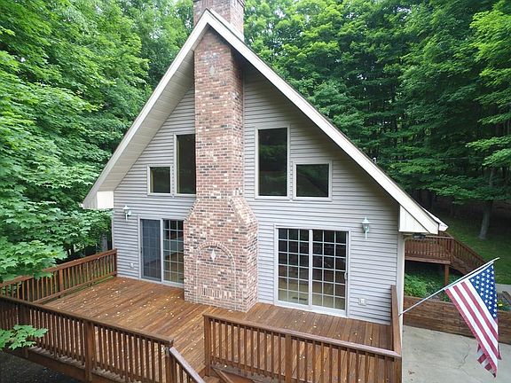 This unique property near Oglebay has the features of a vacation retreat chalet in a private wooded area. Impressive large open great room with 22' high cathedral ceiling, wood-burning fireplace & an abundance of natural light. Two sliding glass doors extend onto a large deck perfect for entertaining or relaxing among nature. There are two spacious bedrooms, two full baths & a finished rec room in the basement with a gas fireplace. Oversized two-car garage & workshop area. This is a must see!