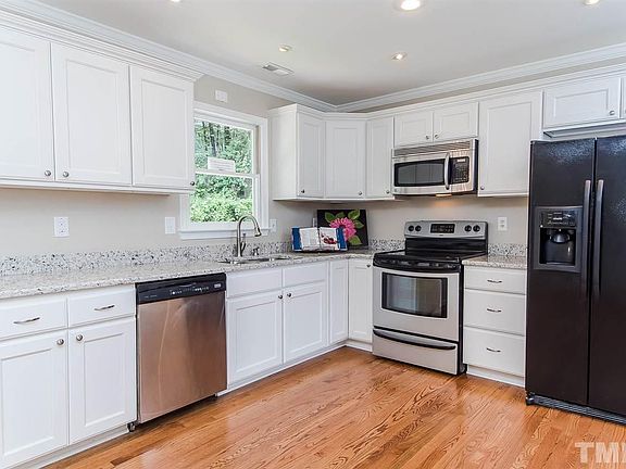 Beautifully renovated home in great Cary neighborhood. Fabulous kitchen w/ new, white cabinets, granite countertops, SS Stove, DW & M-wave; walk-in pantry. Fridge included. Newly refinished hardwoods thru-out except carpet in LR & tile bathrooms. Huge master BR w/ walk-in closet, spa bath w/ garden tub w/ leaded glass windows. Sep laundry/mud room. Freshly painted interior, brand new roof, HVAC 2015, move-in ready! Large, lovely paver and stone patio, backs to woods for privacy and peacefulness!
