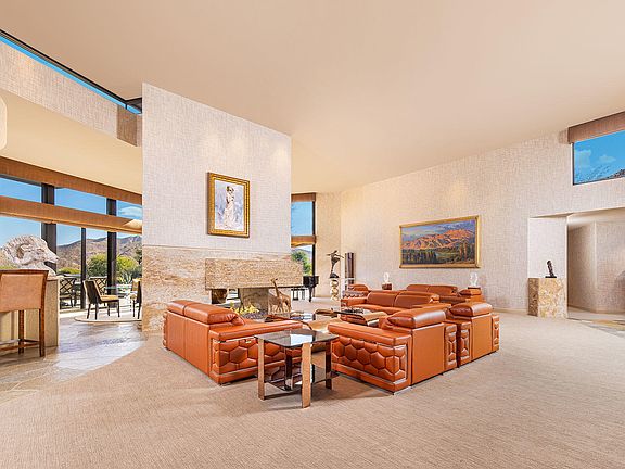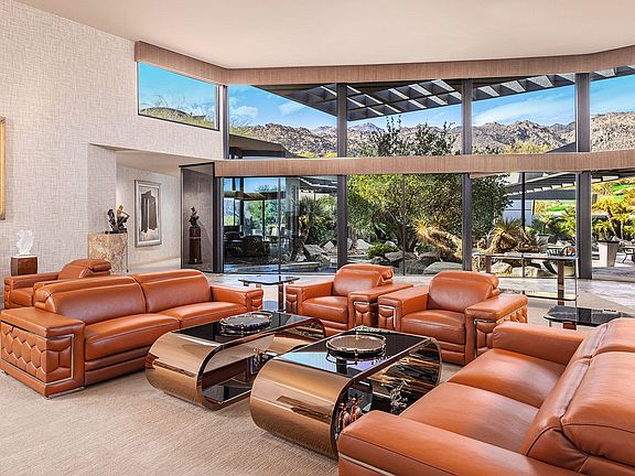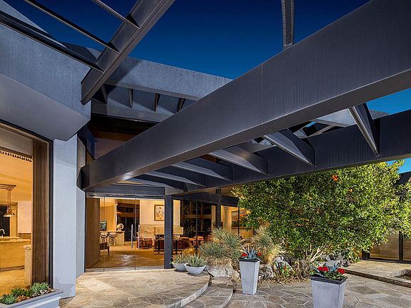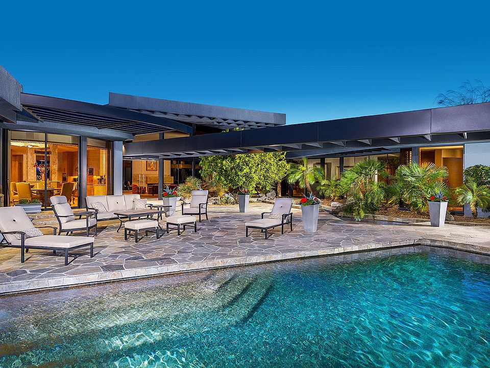 Timeless Modern Architecture defined with copper beam elements creating a dramatic entry into this bold statement by designer Guy Dreier. Handcrafted gates and stacked stone waterfalls are the entrance into the lushly landscaped entertainment patio which includes a private pool, sunbather's deck, multiple dining areas, professional barbecue and spectacular views of the Santa Rosa Mountains. Expansive great room with soaring ceilings and walls of glass that completely bring the outside into the inside living and maximize the views of the mountain range, entertainment courtyard and the golf course; sophisticated furnishings set the stage for casual desert living and elegant entertaining. Gourmet kitchen and media room for daily living. Master Suite has floor-to-ceiling sliders and corner window offering spectacular views of the surrounding mountains and golf course. Four interior guest suites with one currently being used as an office. Additional outdoor golf course patio can be enjoyed.