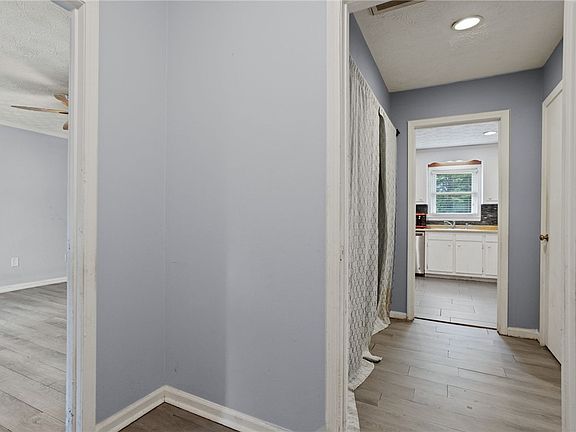 Down the hall, the private quarters of the home await. Here, a second full bathroom serves two generously sized bedrooms, each offering comfortable living spaces with ample closet storage. Across the hall, the primary bedroom provides a peaceful retreat, complemented by an attached full bathroom, ensuring privacy and convenience for the homeowners.