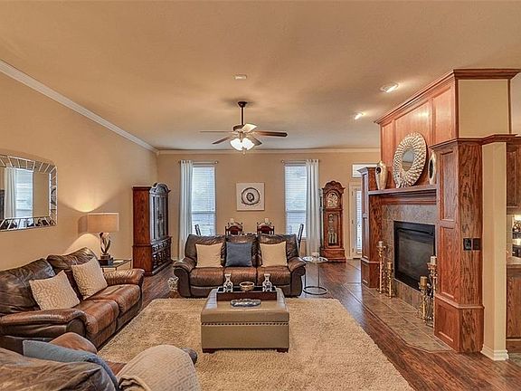 Come experience this warm & inviting home in Summit Lakes tucked away on a quiet lake street! This open concept home is perfect for large gatherings. The double sided fireplace is shared by the living area as well as the island kitchen & casual dining. The owners' suite offers a Jacuzzi tub & great walk-in closet. Of the remaining bedrooms, one is very large & holds a king bed & furniture. The third bedroom offers a built-in desk while the fourth room would make a perfect study. Updates to this lovely home include a storm shelter, sprinkler system, electrical box for hot tub, updated floors in living, new garage door/opener, new roof, gutters & exterior paint, extensive landscape, trees & a professionally treated lawn. Step out on the double patio & enjoy the spacious backyard large enough for a nice pool! This home has been well loved & it definitely shows!! **Sellers will offer a $2,300 carpet allowance with an acceptable offer for you to personalize the bedrooms**