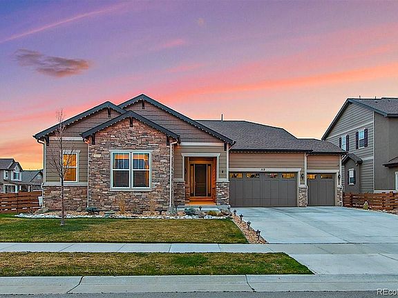 Remarkable 4 bed, 5 bath home with backyard views that overlook the Colorado Front Range via a hand-crafted stone patio surrounding an entertainers fire pit. This ranch-style home is situated on an expansive corner lot, which gives ample room for the 3 car garage and the spacious backyard overlooking the park. With a stunning finished basement, this cozy home is finished at 5,231 square feet. Custom finishes throughout the home, including $150,000 of recent interior upgrades make this Colorado home a unique revelation. For a luxurious touch, there is wainscoting in the front entry and the formal dining room and immaculate flooring throughout the main level. The kitchen boasts ceiling-length cabinets that feature top cabinets with a glass finish, a double oven perfect for the home chef, and an extensive island. The owner's suite is complimented with a window nook, a 5-piece bath, and an expansive walk in closet with custom shelving. The lower level offers a gym space with french doors, a dedicated study, guest bedroom with walk-in closet and 3/4 bath, and a large entertainment space.