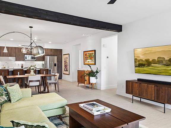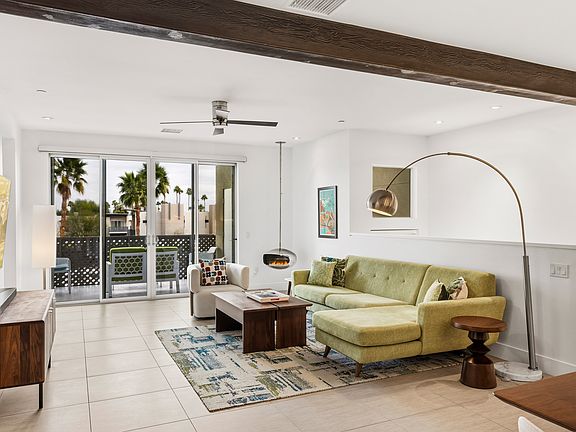 First time on market! Luxury two bedroom suite + 1/2 bath, 1500 sq foot condo on second story of 64 @ the Riv Condominiums. Newly built in 2019, and completely repainted and updated in November 2025 with new contemporary furniture, brand new beds, mattress, linens and well stocked kitchen for cooking and entertaining. Enjoy High Speed Wifi, Cable, Utilities included. All new wall mounted Smart TVs. Undercabinet LED lighting and dimmable lighting throughout. Ceiling fans in all rooms. Retro modern biofuel "Cocoon" Fireplace and stunning upper level views overlooking the resort style pool. This unit is eco-friendly with solar, tankless water heater and commercial grade windows for sound and light control. Heated pool and hot tub for complex is surrounded by palm trees and stunning San Jacinto views. Community has 2 gas BBQ's, fire put and lounge area, and restrooms at pool. Off leash dog park. Gated community. Walkable to restaurants, Desert Regional Hospital, and 4 FREE electric car charging stations on site for residents.