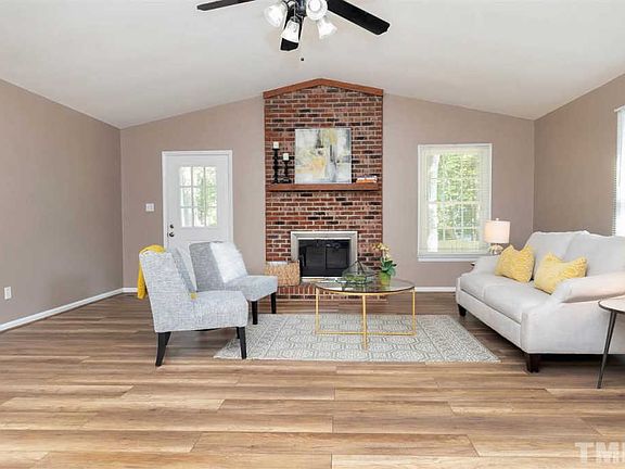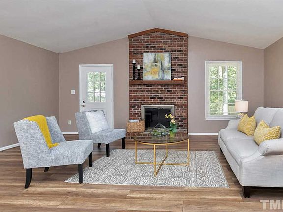 Desirable ranch home in sought after Trappers Run. Beautifully situated on wooded, large, nearly flat lot. Gorgeous interior is very clean and tastefully painted. Home features an open floor plan with beautiful wood like flooring in the main living area and kitchen. Charming family room with brick fireplace. Luxurious granite countertops in kitchen including an island. 3 spacious bedrooms/2 full baths. Huge deck. Wide driveway with a garage! Walk to Greenway, Bond Park, & minutes to DT Cary. This is it!