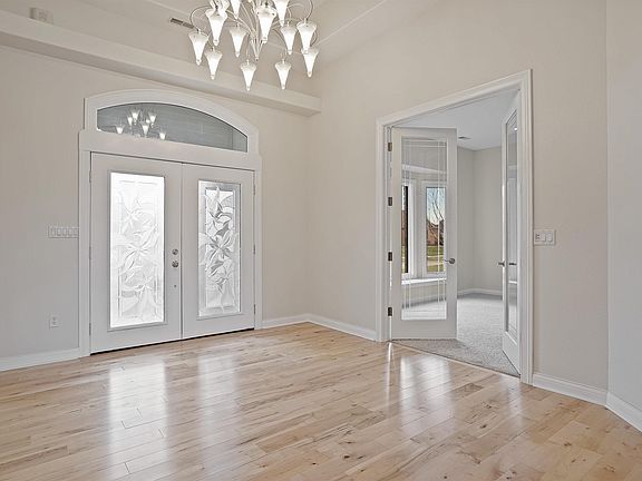Impressive custom open concept split bedroom ranch on pond in Twin Eagles. An abundant 7,200 fin sq ft with 4 bedrooms, 4.5 bathrooms, 2 full kitchens. Stamped concrete path to stately stone porch through beautiful glass double doors into foyer. Stunning view over pond with plenty of natural lighting and height with tray/cathedral ceilings. MAIN LEVEL: den/office with built-in desk, shelves. bath and tall linen closet along hall to master. Master 23x16 with luxurious bathroom - split sinks, linen, 2 walk-ins, tiled shower, garden/jet tub, and a private workout room. Screened-in balcony from master to breakfast area. Dining room has an elegant chandelier matching foyer. Breakfast area tall windows with panoramic view of pond. Corner fireplace shared by living room and breakfast area. Kitchen granite countertops, island, stainless appliances. Laundry room has a utility sink, counters, built-in ironing board. and a nice closet. 2nd bedroom with bathroom also on main. LOWER LEVEL: kitchen granite countertops, breakfast bar, walk-in pantry, dining with panoramic view. Sliding glass door to patio. Corner fireplace shared by dining and family room. Theatre, rec room, multi-purpose room, 3rd bedroom/guest suite with bathroom, 4th bedroom, and 4th bathroom also on lower. Mechanical room service access from the garage. Garage is heated. Whole house generator. Irrigation system.
