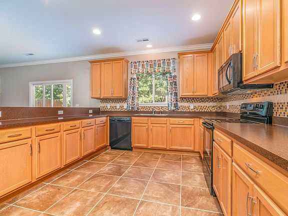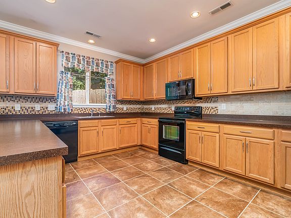 - Kitchen: Bar, Pantry, Floors-Tile, Cabinets-Stained, Backsplash-Tiled, Recessed Lights