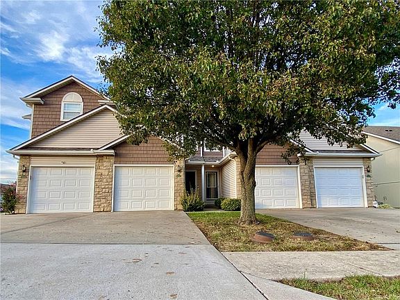 Enjoy peace of mind knowing the HOA takes care of the lawn, property insurance, exterior windows, siding, roof and it has a Brand New Roof. Great townhome in Raymore with an open floor plan close to 58 Hwy, eat in kitchen that walks out to a 10x10 private deck, corner fireplace in the corner of the family room. Upstairs you will find 2 spacious bedrooms including a primary suite with a private full bath and generous closet space. The second bedroom also offers a large closet, and has its own full bathroom in the hallway. The laundry is conveniently located upstairs between the bedrooms. This is one of only a few townhomes in the neighborhood with a full basement for extra storage or potential for another bedroom or a rec room.