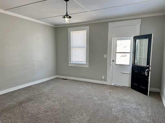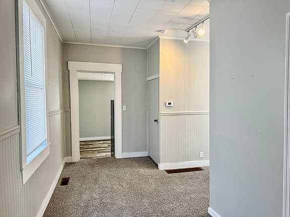 Newly renovated house in Liberty, IN. Two bedroom, one bath on quiet side street. Newer flooring, fresh paint, central air, gas heat, kitchen appliances provided including dishwasher, washer/dryer hook up on main floor, window blinds, ceiling fans, one car attached garage. Large rooms with tall ceilings. Eat-in kitchen. Two huge bedrooms upstairs with balcony off rear of house. NO PETS, NO SMOKING. One year lease. Tenant responsible for all utilities and lawn care. NO PETS, NO SMOKING. One year lease.