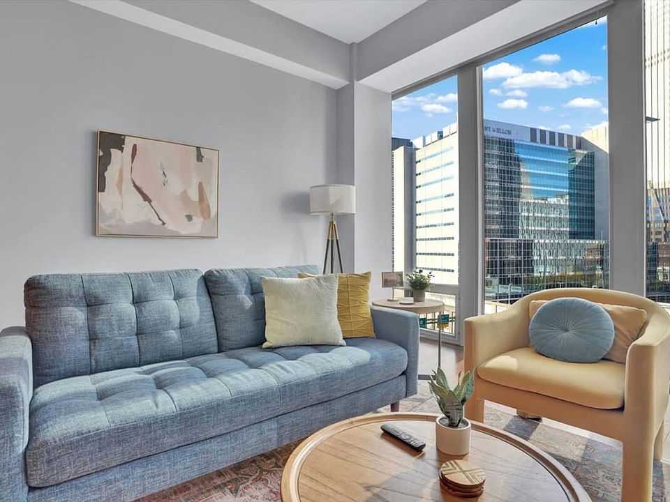 Our trusted partner proudly presents a historic loft elevated with modern renovations, located in the heart of Downtown Pittsburgh. This condo is perfect for leisure and business travelers, offering seamless check-in, fast Wi-Fi, and a tech-first approach to make you feel at home on the road. This spacious two-bedroom apartment features an inviting living area, a fully equipped kitchen, and bathrooms complete with toiletries. Enjoy access to the building's fitness center with strength and cardio rooms. Additional amenities include an in-unit washer and dryer, a smart TV with streaming apps, and complimentary coffee. Paid parking is available in the parking garage. Pets are allowed with a maximum of two pets (40lbs combined) and a pet fee based on stay length. Emotional support animals may incur a pet fee and can be declined from stays. Optional services such as mid-stay cleanings and early check-in/late checkout are available for additional fees. Centrally located in Downtown Pittsburgh, the property is just steps from PPG Paints Arena, the leading entertainment venue and home of the Pittsburgh Penguins. With a walkability score of 94 and a transit score of 96, endless restaurants, entertainment, and activities are just around the corner. A car isn't necessary to explore the area, and you can enjoy walkability throughout the city during your stay. All properties are smoke-free environments. Smoking is not permitted within or outside of the suites, and any sign of smoking may result in immediate termination and recovery fees starting at $500. Check-in is at 4 PM and check-out is at 11 AM, with a $75 per hour late fee. There is a $200 penalty for removing smoke detectors and a $200 penalty for lost key fobs. No outside guests are allowed without permission. A valid photo ID is required to complete the booking. Guests must agree to not disturb neighbors and observe quiet hours from 9 PM to 8 AM. The home is monitored with decibel sensors for compliance with the noise policy. Long-term stays (30 days+) are subject to a background search and credit check. The unit is equipped with a smart lock for hassle-free and secure entry. The apartment is equipped with fast Wi-Fi, making it ideal for remote work.