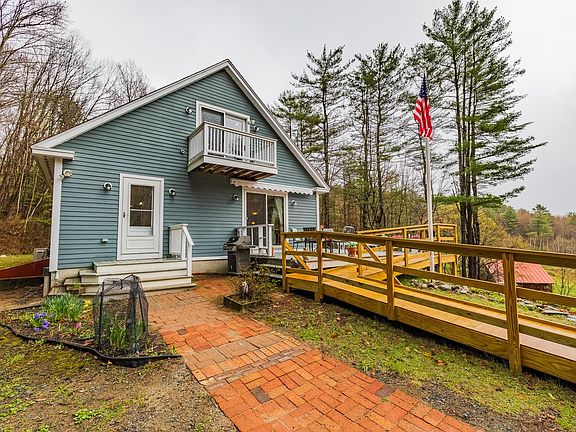 AMAZING VIEWS- Charming 3 bedroom, 1.5 bath, 2,200 sqft Cape on 13 private and serene acres. Gorgeous views of the mountains and hillsides right off the deck throughout every season of the year. Enjoy your morning coffee or an evening drink with a breathtaking view every day. The main area is open and flows seamlessly from Kitchen, Living Room, and Dining Room featuring lovely oak floors and a fully restored antique woodstove. The multiple sliders and windows bring in tons of natural light and allow you to take in the natural surroundings and the lovingly landscaped gardens from many angles. The first floor also features a more private bedroom, full bath, and a den or office. Upstairs are two additional bedrooms (one with its’ own private deck), half bath, craft room with shelving space and a large common area perfect for a reading room. The full basement houses a washer and propane dryer as well as generous space and shelving for storage and projects including a large workshop. Great location to take advantage of the privacy and natural landscape Vermont countryside has to offer while still being within a 25 minutes’ drive to Woodstock, VT and Lebanon, NH. Septic System is designed as a 2 bedroom system. Rumrill Farm Covenants may still be in effect.