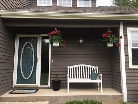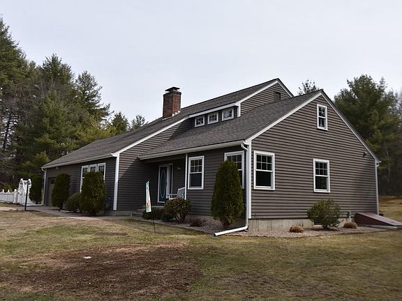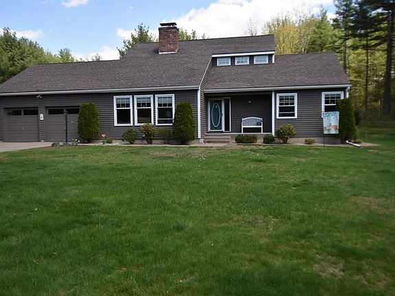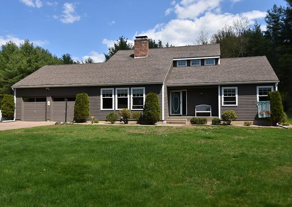 Amazingly private setting for this Cape-style home, yet convenient proximity to everything. Set on 11+ flat acres surrounded by trees and offering a lovely patio, the property features a beautiful in-ground pool, garden, large 14x28 outbuilding and additional 8x16 shed. This home has been well cared for and updated over the years. There is plenty of natural sunlight throughout. The living room has cathedral ceilings and wood stove insert. Updated kitchen with hardwood floors, formal dining room with hardwood floors and beautiful porch leading to paver patio. First floor master bedroom with master bath. Mudroom off of 2-car garage. Second floor offers two additional bedrooms and as well a room ideal for a nursery, office or third bedroom. Economical natural gas heat supplied by Holyoke Gas & Electric and Central Air. Basement has even more space with a finished rec room.