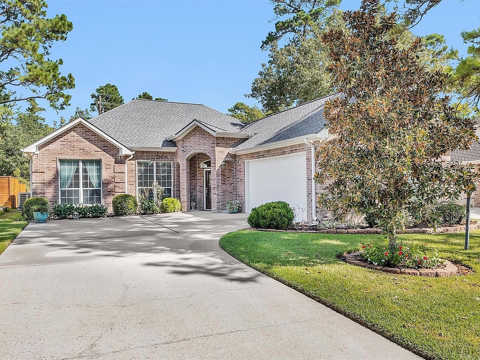 Located in the gated, country-club community of Bentwater on Lake Conroe, this one-story brick home offers screened in back patio with an extra patio just outside overlooking the park like setting. Where you can enjoy listening to birds and watching the wildlife. Home as been very well maintained and is move in ready. NEW A/C 10/2025, 100% primary bath remodel in 2023, New Mircrowave, installed French drains, painted garage and garage cabinets and installed carbon monoxide detectors and security system. Very open concept floor plan with many unique features. You have a study niche just down the hallway. Generous size primary suite with NEW ensuite bath that awaits you! Expanisive breakfast bar in kitchen that overlooks the family room and dining area. Tons of storage & cabinets in this home. Easy access to both Montgomery, Willis and I-45. Served by exemplary Montgomery ISD.