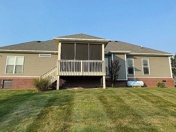 Lovely brick and siding ranch home with very open living/kitchen/dining room area. Gas log fireplace. Split bedroom concept. Formal dining has wainscot. Custom built-in shelving in master bedroom closet, pantry, laundry room and garage. Pocket doors in master bedroom. All stainless steel appliances convey. Wood floors throughout except bedrooms and baths. 1870 sq ft finished living space. Screened in back deck. Buyers agents commission of 3% is acceptable.