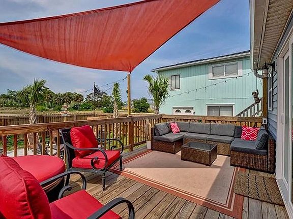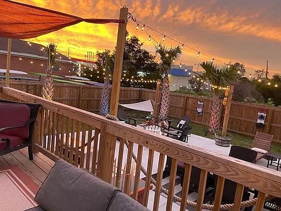 FURNISHED HOME AVAILABLE APRIL THROUGH MID-MAY Dogs Allowed at Pirates Retreat Carolina Beach Rental 3 Bedroom / 2.5 Bathrooms / Sleeps 8 Right behind Berts Surf Shop and across the street from Hoplite Irish Pub, walk to the beach, the canal, grocery stores, shopping, and restaurants from this adorable Pirate themed family home. Dogs are allowed! Up to three dogs allowed with extra pet fess. The backyard is a buried treasure: with a completely fenced yard and palm trees all around your retreat. A multilevel deck & patio make outdoor living a delight. Multiple outdoor seating vignettes, wood fire pit, palm trees, string lights, outdoor dining and gas grill invite you to stay and make Pirates Retreat your home away from home. Boats and boat trailers are no problem in our huge front yard parking area, and it's even gated! You'll sleep like the ship's captain in our large master bedroom and your mateys can bunk upstairs in either in the kids room or the other Queen guest room. Our beautifully tended home awaits your island visit! Ground Level: Fully fenced front yard. Fully fenced back yard. Fire Pit. Outdoor living room. Outdoor dining furniture. Gas grill. Hot water private shower. 5 steps to front porch. Level One: We are a ground entrance, two story home. Open floor plan. Living Room: Comfortable recliner seating, Wall mounted oversize Smart TV. Kitchen: Fully equipped for any meal you could dream of making at home. Full size refrigerator, dishwasher, microwave and stove. Breakfast Nook. Coffee Bar. Laundry Room with washer and dryer. Half Bath. Primary Bedroom Suite with Queen Bed, Ceiling Fan, Full Closet, Ensuite Bath with Bathtub and Shower, Toilet, Single Vanity. Level Two: Bunk Room for the kids, Two twin over Twin bunks. Hallway Bathroom: Bathtub and Shower, Toilet, Single Vanity. Queen Guest Room, Full Closet.