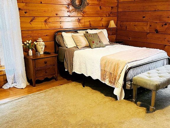 Beautiful, unique log home. New HVAC system, 2021. New dryer, 2021. New refrigerator and gas stove, 2020. Beautiful sunrises and sunsets and a quiet neighborhood, great for walking. No HOA fees. Primary bedroom and en suite bath with huge jetted tub downstairs. Large living room with vaulted ceiling and natural gas fireplace. Large dining area. Separate laundry room. Two bedrooms, loft, and full bath upstairs.