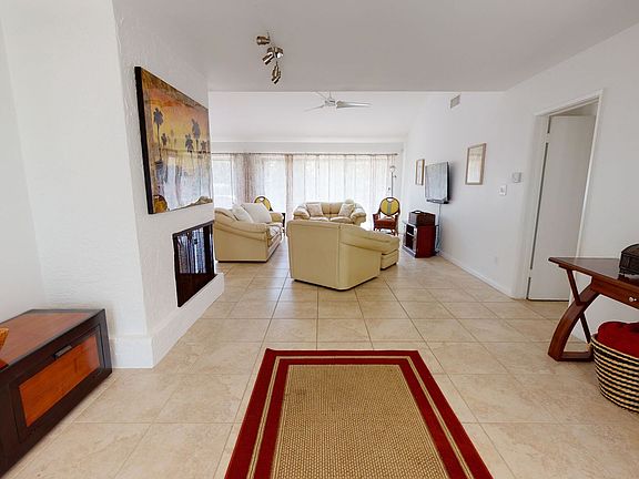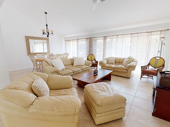 The front door opens to the entry, leading to the main living space with corner fireplace, three sofas, and two chairs that surround a 50" Smart TV with seating accommodating up to 9 adults comfortably. The dining area is part of this open space with a large table where 6 can dine comfortably. This living and dining space is accentuated by large glass sliding doors that fill the room with beautiful natural light and an ocean breeze.