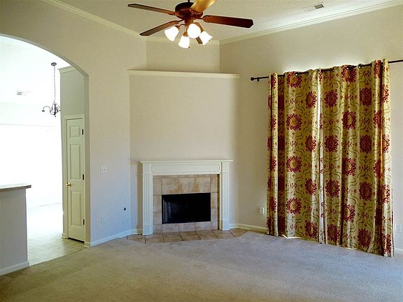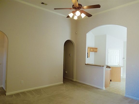 MUST SEE this wonderful home with loads of charm and soaring 11' and 12' soaring ceilings!! Big great room with fireplace. THREE bedrooms and two baths with split floorplan. Master bedroom has great salon bath with walk in closet, whirlpool tub, double sinks and separate walk in shower. Brand new paint in entire interior---clean, clean, clean!! Rear load two car garage and a fenced backyard with patio. So nice......with monthly payments that are less than your apartment rent!