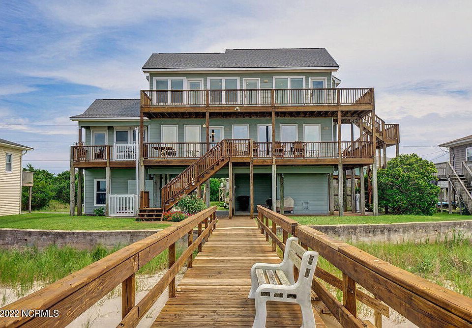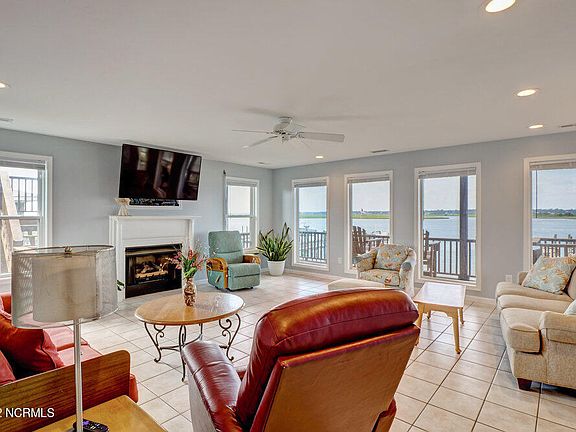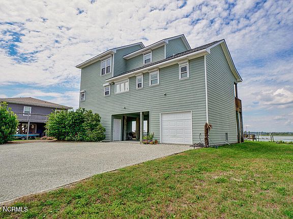 Live the waterfront dream in this newly renovated modern build. Designed as a retreat with the highest standards, this grand estate will impress you by its open layout enhanced by a fully tiled first floor and functional vent less propane fireplace. Every room has a breathtaking view of the ocean sound holding beautiful sunsets. This estate has an interior and exterior stairwell entrance to the home, a house water softener, kitchen filtered water, and hurricane shutters. This home is perfect for everyone, featuring 4 bedrooms, 3.5 bathrooms, and two master bedrooms, both upstairs and downstairs. All rooms are wired with internet and cable, and have their personal entrance to the balcony overlooking the stunning view of the water. If you enjoy spending your days on the water, this is the place for you! You have your own private sandy beach on the sound, pier, and floating dock, with quick and easy access to the ocean and Intracoastal Waterway. You can relax by the water, fish, and swim. It has an enclosed outdoor shower, and plenty of space under the house/yard to lounge and/or grill. The dock has a custom fish cleaning station which features 2 boat lifts with a 10,000 lb. capacity for the larger lift where deep water. This house has exquisite finishes with no detail overlooked: In 2019, all bathrooms remodeled, roof and new upstairs carpet replaced. In 2021, installed new pilings for floating dock, and lift added to the exterior. In 2022, the deck/dock restained, kitchen quartz countertops and new stove installed, and boat lifts restored. This waterfront estate is located in close proximity to the ocean pier, boat ramp, restaurants, and is a short walking distance to ocean access, with many activity options, i.e. putt-putt, roller skating, concerts, festivals, and grades 1-12 summer activities at local church.