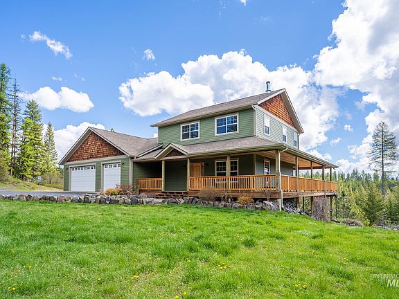 Welcome to the Idaho dream! Sitting on 11.78 acres this 2008 home was custom built with thoughtful intention. The main floor kitchen, dining, office and living room cozy up around the wood stove, are wrapped in windows looking out to the expansive, partially covered deck. Finishes include Australian Cypress flooring, custom cabinets, granite countertops, knotty alder doors and trim and stainless steel appliances. Take in the views for miles, listen to the birds and watch wildlife drink from the pond. Upstairs are a bath, two bedrooms and the designated suite with tiled walk-in shower, soaker tub and more of those views. The full unfinished walkout basement is ready for your personal touches with a full bath already plumbed in. Take advantage of the flat front yard, tiered garden space and incredible greenhouse. On the NE end of the property you'll find the insulated 30x60 shop with its own bathroom and large heated workshop space, a corral and barn complete with new siding and a blue pine floored tack room.
