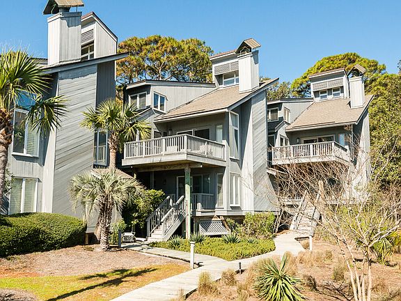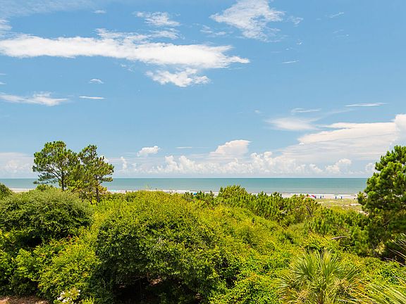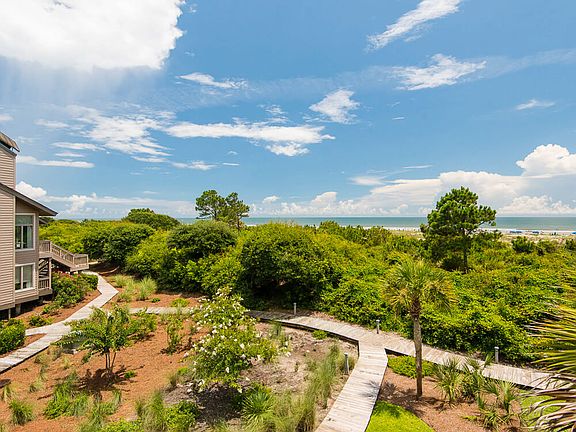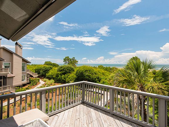 Just steps from Kiawah Island's 10-mile beach, this bright beach getaway enjoys convenient access to the main gate and many of the Island's world-class amenities, including golf, tennis, and dining. Just outside, the beach boardwalk winds its way to the ocean. Residents will enjoy a fantastic West Beach Village location, which will soon be home to a new luxury hotel, distinctive shops and restaurants, and additional Resort-style amenities including a brand new Cougar Point clubhouse. For more information on this exciting project, click here. The private covered entrance opens into a light tiled foyer accented with beadboard wainscoting. The first floor hallway leads to three generously sized bedrooms with plantation shutters and private baths. An open staircase rises to the shared living spaces on the second floor. The two-story great room combines the living room, dining room, and kitchen to each other. Featuring honey-toned hardwood flooring, vaulted ceilings, a large fireplace, and walls of windows filled with natural light, it is a perfect place to entertain and enjoy gorgeous ocean views. Oversized sliding glass doors open out to the back deck and screened porch. The fully equipped kitchen features custom cabinetry, hardwood floors, granite counters, upgraded appliances, a breakfast nook with granite table and built-in window seats, plus an elevated L-shaped counter that offers additional bar seating. Just off the kitchen, the dining room accommodates eight comfortably, enjoys ocean views, and has direct access to the screened porch. Shaded and private, the screened porch is a great spot to enjoy coffee or dine al fresco. The third-floor master suite offers ultimate privacy, vaulted ceilings, large walk-in closet, sitting area, and picture windows with beautiful ocean views. The upgraded private en suite enjoys tile flooring, a vaulted beadboard ceiling, and large walk-in shower. Offered furnished, additional features of this move-in ready beach home include an outdoor shower and an outdoor storage closet for beach chairs and gear.