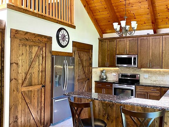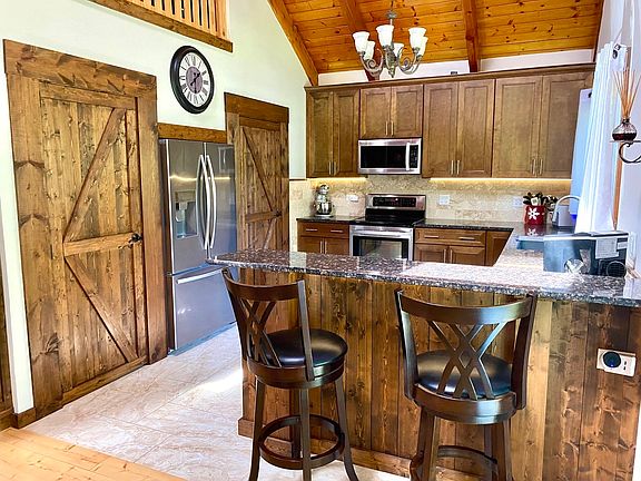 Dont look any further, this house has it all! This cottage style 3 bedroom and 3 full bathrooms house is conveniently located at dead end street with magnificent river views. 1st floor has gorgeous kitchen with SS appliance, two walk-in pantries, sliding doors leading to wrap around porch, two bedrooms, living room with build in custom entertainment center, wood burning fireplace, dinning room, mud room and full bath. 2nd floor features - master bedroom, full master bath with stand up shower, walking closets and spacious loft currently use as an office. The whole 1st and 2nd floor have vaulted ceilings with skylights. Full finished basement with modern, full bathroom with custom walk-in shower, spacious recreation room with free standing electric fire place, build in custom entertainment center, a lot of storage space with shelvings and closet space, laundry/work room, tankless water heater. All the TV's and camera system comes with the house. The house sits on extra wide lot next to a creek. There are also 4 parking spaces, 1.5 car concrete slab ready for a new garage, 20x20 concrete patio and 2 sheds 18x10 and 10x8! Walking distance to down town of Algonquin! Like fishing? You can do it right in front of the house!
