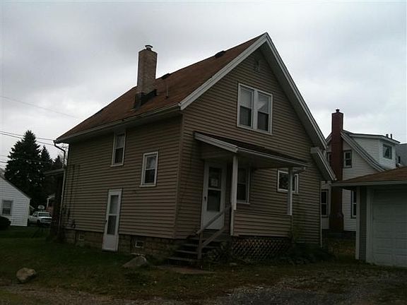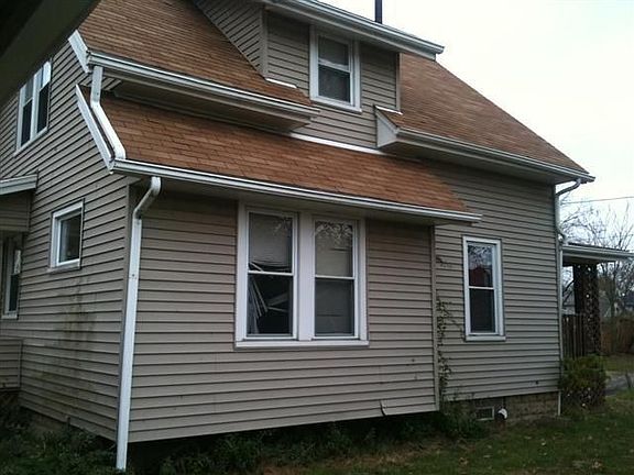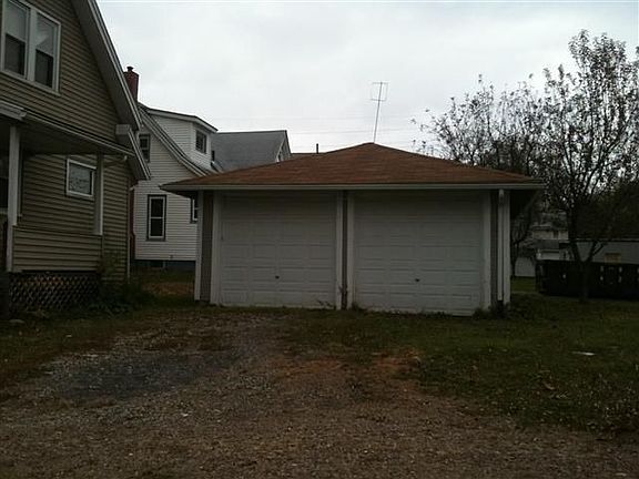 Exterior Features: Two story beige home with white accents, has nice curb, overall looks in great condition. Siding: Wood and vinyl exterior wall is in nice shape, clean and free of any damage. Windows: Intact. Soffits and Eaves: Intact. SF: (Lot) 6500. SF: (Home) 910. Patio/Porch: Wood porch in front of house. Roof: Asphalt shingle, is in good shape. Driveway: Gravel/dirt. Interior Features: Looks in nice condition overall, needs minimal repainting and some cleaning but nothing major, Note that garage is full of garbage from clean-out. Living Room: Green walls, carpet, wood trim, walls need some touch ups. Dining Room: None. Kitchen: Vinyl floor, cabinets & sink present, in good shape. Bathroom: Walls need minor touch ups, vinyl floor, appliances intact. Bedroom: All appear healthy & intact, white walls, carpet, closet space. Basement: Cinderblock make up, concrete floor. Mechanics: Unknown. Garage: Two car, is located behind home, full of garbage from clean-out.