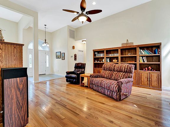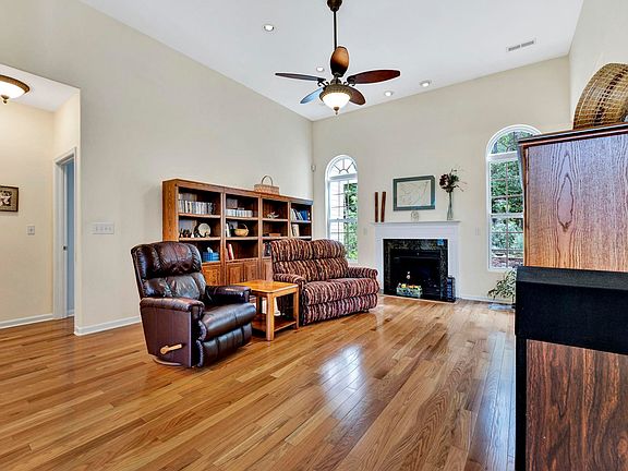 Lovely home on over 2 acres. You will appreciate the rustic setting the minute you pull up into the canopy of trees and plethora of season-long beautiful blooming native perennial plants, shrubs and trees. There is no HOA with this one! Outside the brick accents and covered front porch are welcoming. Inside the gleaming hardwood flooring, multiple windows and tall ceilings make the open floorplan bright and spacious. The dining area is large enough for entertaining and has plenty of room for your farm table. The great room is open and flows well into the dining room and breakfast area. It has large windows for great bird watching in the back yard. The well equipped kitchen has granite counter tops, lots of cabinet and counter space, a pantry, stainless sink, stylish black appliances and a peninsula large enough for stools and a breakfast area. The primary bedroom is large with a double tray ceiling, multiple windows and a full bath with a spa like soaking tub, separate walk in shower and a nice sized walk in closet. The split floorplan ensures privacy. Two secondary bedrooms, both with walk in closets, are also on the main level and share the additional full bath with tub/shower combination. Upstairs the fourth bedroom/ bonus room could be used for a home office, craft area, movie room, or guest suite. The walk in laundry room has shelving for storage. Storage abounds in this home with walk in attic storage upstairs, a walk in coat closet and a convenient space under the stairs. Park your cars in the two car attached garage or use this space for a workshop. The shed out back is a great space for gardening tools or lawn equipment. Enjoy crisp fall evenings on the back patio overlooking the private back yard. What a great spot for entertaining with cookouts or a bonfire. Enjoy some tailgating and be the favorite host this season. There is also room to park your RV with a 30 amp RV power. This home has been lovingly maintained and has several recent upgrades. The two zoned heat pump HVAC was replaced in 2023. The upstairs room has its own zone for maximum comfort. The roof was inspected and the septic tank was pumped in 2023. The water heater was replaced in 2022. The hardwood flooring is only 3 years old. This home is ready to move in and will be an amazing place to start making your memories!! Call today and set up a private showing.