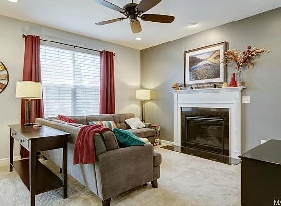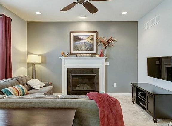 Cottleville home on premium lot across from Vantage Park- lake views will never be blocked! Walking distances to downtown Cottleville which offers: Legacy Park, multiple Restaurants, Cottleville Winery, and Mannino's Meat Market. Walk into bright living room w/9’ ceilings. The kitchen, brkfst & family room flow – allowing you to enjoy conversation & the gas FP from all three! Kitchen has SS appliances, 42” dark cabinetry, brkfst bar, pantry. Brkfst area has slider to back yard and large patio – perfect spot to enjoy view! Custom built wine bar & refrigerator included! Mstrbdrm suite w/vaulted ceiling, fan, sep. walk-in & linen closets. 2 add’l bdrms w/walk-in closets, full bath & third room as office complete the 2 story. LL has 9’ ceilings, rec room w/ceiling fan, den & rough-in for full bath. 3 car garage, UV tinted windows on south side, recessed lighting, main flr laundry w/sink, subdivision pool. Over 2500 sf of total living area, conveniently located to 364, 40 and 70.