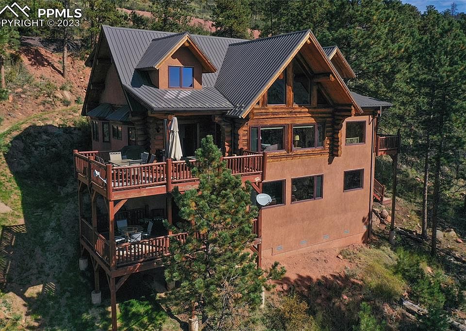 Nestled amongst the majestic Ponderosa pines of Woodland Park, Colorado, you'll discover a truly unique property—a custom-built lodgepole pine log home that defines mountain living at its finest. This remarkable residence seamlessly marries the charm of a traditional log cabin with the convenience of modern amenities, offering a one-of-a-kind sanctuary for those seeking an authentic mountain escape. As you step inside this exceptional home, you'll be immediately captivated by the pristine natural beauty of Pikes Peak. Crafted from lodgepole pine logs sourced from British Columbia, the open-concept living space features a magnificent stone fireplace, perfect for cozy evenings by the fire. With vaulted ceilings and expansive windows that flood the space with natural light and showcase the surrounding woods, the interior exudes a genuine rustic elegance. The breathtaking views of Pikes Peak from nearly every room add an extra layer of magic to this home. The gourmet kitchen, complete with granite countertops, stainless steel appliances, and a generous island, is a hub for culinary adventures and socializing. With three generously sized bedrooms( 2 of them en-suites), including a luxurious master suite with an en-suite bathroom featuring a soaking tub, separate shower, and double vanity, the home offers comfortable accommodations for residents and guests alike. The large family room with a wet bar offers ample space for entertainment. Additionally, a loft space, perfect for an office or reading nook, adds a touch of versatility. Multiple decks with panoramic views of Pikes Peak and the valley floor below offer a unique opportunity to provide space for outdoor relaxation, al fresco dining, and taking in the awe-inspiring mountain scenery. Whether you're looking for a year-round haven or a vacation retreat, this property offers an extraordinary opportunity to immerse yourself in Colorado's mountain paradise and represents more than a residence; it's a lifestyle!