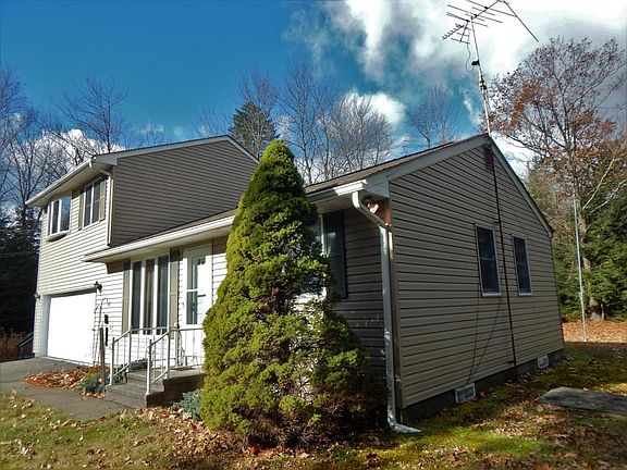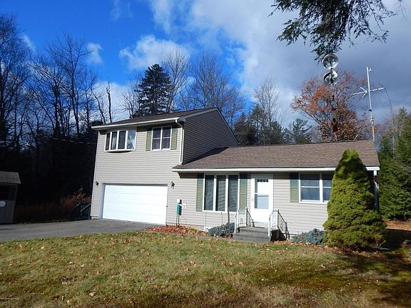 PRICED TO MOVE! Walking distance to the lake with NO DUES! Well built 3 bedroom home located in Pocono Summit Lake. Split level ranch. First level living! Second living area above the garage perfect for guests and entertaining. Features open living room with picture window and hardwood floors. Updated eat in kitchen. Each spacious bedroom features wall to wall carpet. Bathroom with lovely tile work. Second floor family room offers private additional living space. Two car garage, 2 storage sheds, and attic storage provide lots of space to store all your items. One shed is carpeted and has heat & A/C. It's like having an additional room! Zoned heating and full insulation help to keep heating bills low. All this on almost half an acre of flat cleared land. Very private setting.