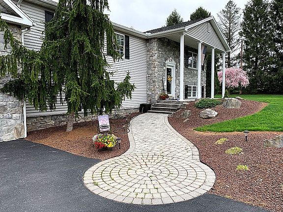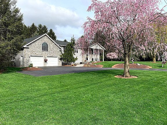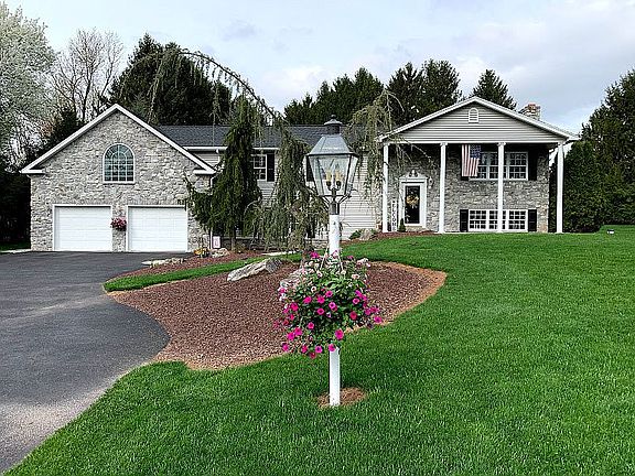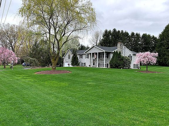 Privacy is yours with this beautiful 3258 sq ft, 3 bd 3 bath raised ranch home. The main level offers an open floor plan with a combined kitchen and dining area that accommodates large family gatherings. The home sits on 1.3 acres of land. Your view out the front is a beautifully manicured golf course and out the back the property is bordered by mature evergreen trees that provide privacy all year long and offers a variety of wildlife. This home welcomes you with a dramatic granite foyer floor. The granite extents up the extra wide stairs to the carpeted living room to the right with large windows that provide a perfect view of the golf course across the street. Straight ahead leads to the spacious kitchen with a large island and dining area with windows offering great views to the rear. The spacious owner’s suite is flanked with glass French doors on either side. One set opens into a large private bathroom with a stand-up shower and a jacuzzi tub. The other set of doors open into a room that could be a private office or an exercise room with another great view of the golf course. This floor also includes 2 additional bedrooms and another full bathroom. Downstairs there is a family room with a brick fireplace that has been converted to natural gas so a cozy fire on a cold winter night is just the flick of a switch away. A set of glass French doors opens from the family room into a sitting/reading room surrounded by windows and a door that opens to a covered patio in the rear. This level also has a bath with a stand-up shower, office, laundry room, and a play/work room which leads to an oversized two car garage.