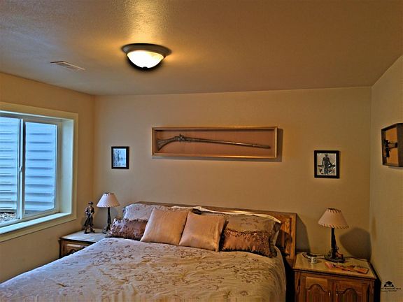 This exquisite 5 bedrooms, 3.5 bath home has an open floor plan, 2 Master Suites and is located on 5 acres with NO COVENANTS just minutes from Spearfish. Horses are allowed this property and a 65x40 barn/shop with electricity and water hydrant is also on the property, a few steps from the house. Included in this amazing home is a furnished home office along with all the furniture on the lower level. This home as an additional kitchenette, large living area, 3 bedrooms and an additional laundry in the basement... the possibilities are endless. This home is a must see. You can watch the sunrise or sunset from either the front or back deck.