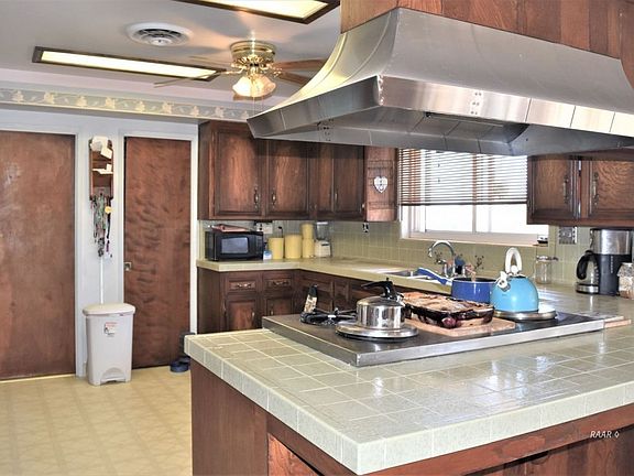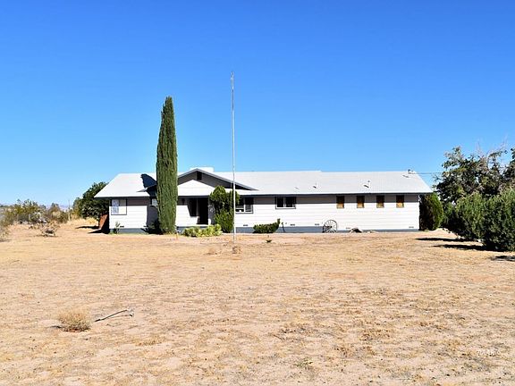 Entry has laminate wood floors, side light and coat closet. Large living room with an unpermitted patio enclosure to the rear. Kitchen with tile countertops, breakfast bar, wall oven, cooktop, dishwasher, walk-in lighted pantry and an abundance of cabinet space. Guest bedroom features laminate wood flooring. Hall bathroom has solid surface vanity top and fiberglass tub/shower insert with glass doors. Spacious master bedroom features his and her closets. Master bathroom has solid surface vanity top and fiberglass shower insert with glass doors. Off of the master bedroom is the second bonus room with wood laminate flooring and wall evaporative cooler. Attached over-sized two car garage (630 sf) with shop lighting and mud sink. Detached two car garage and multiple carports. 5 acres. Pipe horse corral, 4 covered stalls with feeders, washing station with power for grooming, fenced rear yard, dog run, flag pole and more! Outbuilding is 1 bedroom 1 bath with an evaporative cooler and wall furnace. Out building has a separate water and gas meter.