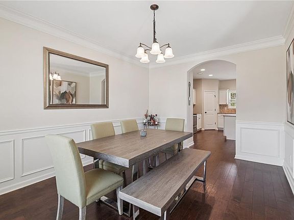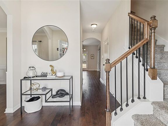 Gorgeous home with on-trend finishes throughout! Enjoy a beautiful Southern-style front porch—perfect for rocking chairs and relaxing afternoons. Step inside to a large entrance foyer with a formal dining room to the left, complete with classic chair railing. Lovely wood floors flow through the dining room and hallway leading to the bright, open kitchen. The kitchen features on-trend white cabinets, an island with seating, granite counters, tile backsplash, stainless steel appliances, and a spacious breakfast room. Arched entries add an elegant touch. A convenient half bath completes the main level. Upstairs, retreat to the oversized primary suite with an en-suite bath offering dual sinks with granite counters, a separate soaking tub, and a glass-enclosed shower. Three spacious secondary bedrooms and a full bath provide plenty of room for everyone! The upstairs laundry room adds everyday convenience—no more hauling baskets up and down the stairs! The large, fully fenced backyard offers excellent privacy and includes a spacious covered patio perfect for grilling and entertaining. Enjoy fantastic community amenities including a pool, park, playground, sports courts, and pavilion. Don't miss your opportunity to tour this home today!